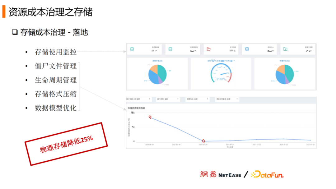 通过存储使用监控、僵尸文件管理、生命周期管理、存储格式压缩和数据模型优化的举措,近几年数据的物理存储降低25%,当前周期内数据存储的占用值处在稳定阶段。