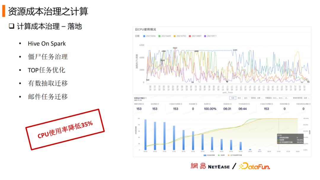 通过僵尸任务治理、邮件任务迁移等策略执行,今年2月以来CPU使用率逐步降低且趋于稳定。资源空闲下来,数据使用方可以及时获取数据,调整运营策略。