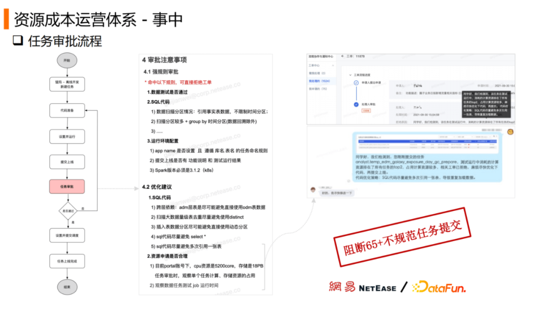 事中主要是对数据任务的上限审核。目前是主要围绕数据任务占用计算资源、存储资源、SQL代码规范以及调度信息设置四块进行审核,避免不规范的任务上线,从而影响核心报表的一个数据产出。