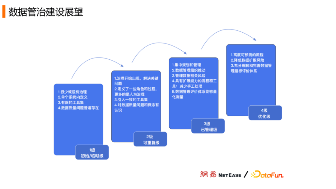 第三阶段是管理级,引入了可扩展的数据管理流程并且将它制度化。从数据生产的链路、整体的视角去集中规划数据治理的一些相关功能。这个时候组织开始关注管理与数据相关的风险,并且确定数据管理评价,可量化的一些指标体系。
