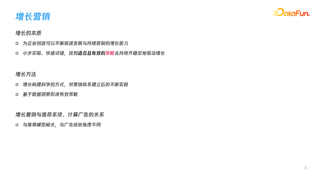 近些年来,增长的概念逐渐被大家所关注,在我们看来,其本质是希望构建一个增长能力,帮助企业实现不断发展和持续获利的目标,这些年在应用实践方面,大家形成了一些有效方法,无论是引入国外典型的增长范式,还是结合本土化改造和升级后的方法,都是通过小步的实验,快速的试错,希望探寻适合且有效的策略,推动业务的持续增长,这个过程包括应用数据的方法、应用增长的方法论构成相应的营销体系,通过不断的实践,支持每个环节用户的持续转化。在我们工作实践中,也常常发现这类工作与推荐模型以及计算广告有相通之处,但站在企业的视角上又有些不同,比如,广告投放更偏重于单次转化,随着转化链路越长转化难度越大;而增长考虑的是在用户全生命周期中,如何能够更好地让用户价值和用户体验达成的平衡,这里不仅是单次转化更是用户全生命周期的多次交互和持续转化。