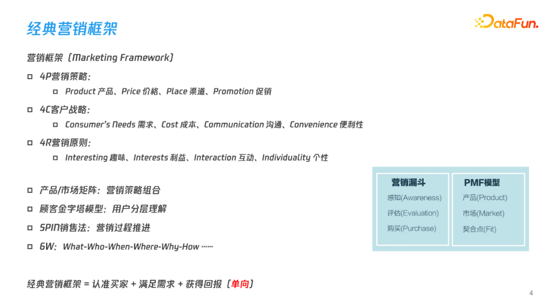 参考经典营销框架的方法和思路,通过对用户的理解,战略设计,以及产品、市场的分解,有很多数据营销可落地应用的角度值得借鉴。经典营销框架主要解决的核心问题是想办法认准用户,满足用户的需求,最终获得相应的营销回报。经典营销框架下有很多营销理念提出,但这类传统营销学更多站在供给方的思路单项地传递。