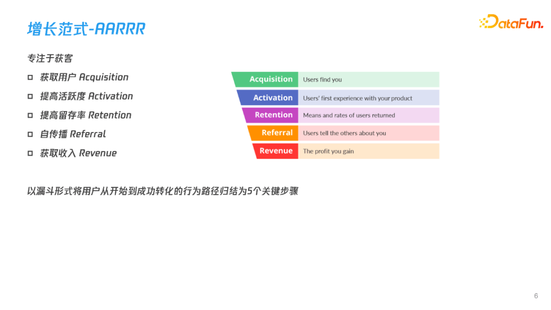 我们看到一些经典的增长范式,最常见的是AARRR增长范式,也有人称为增长模型。AARRR关注最多的是获客流程,希望通过获取大量匹配的用户,提高用户活跃度,在保证留存率的情况下,促使用户进行口碑的传播,最终获得收入增长,这套增长范式,至少有两点值得借鉴,一是对获客重要性的关注,二是漏斗形式的转化;这个范式对其他范式的增长方法的设定,构成了基础的参考。