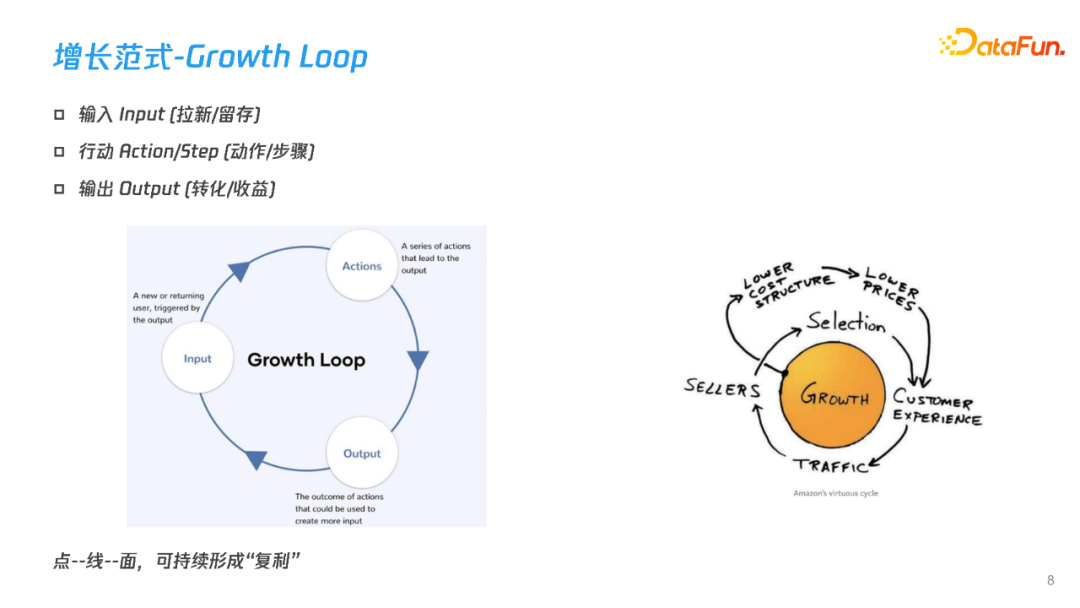 这个增长范式构成的主要要素,包括促进飞轮一些关键要素的结合,使得这些要素形成循环迭代,他在动作之后产生的输出,这些输出又反馈到输入阶段,再返回到拉新或者增量流量,形成良性循环,带来持续增长,这个增长方式其实在业内大企业和一些项目里发挥了不错的作用。