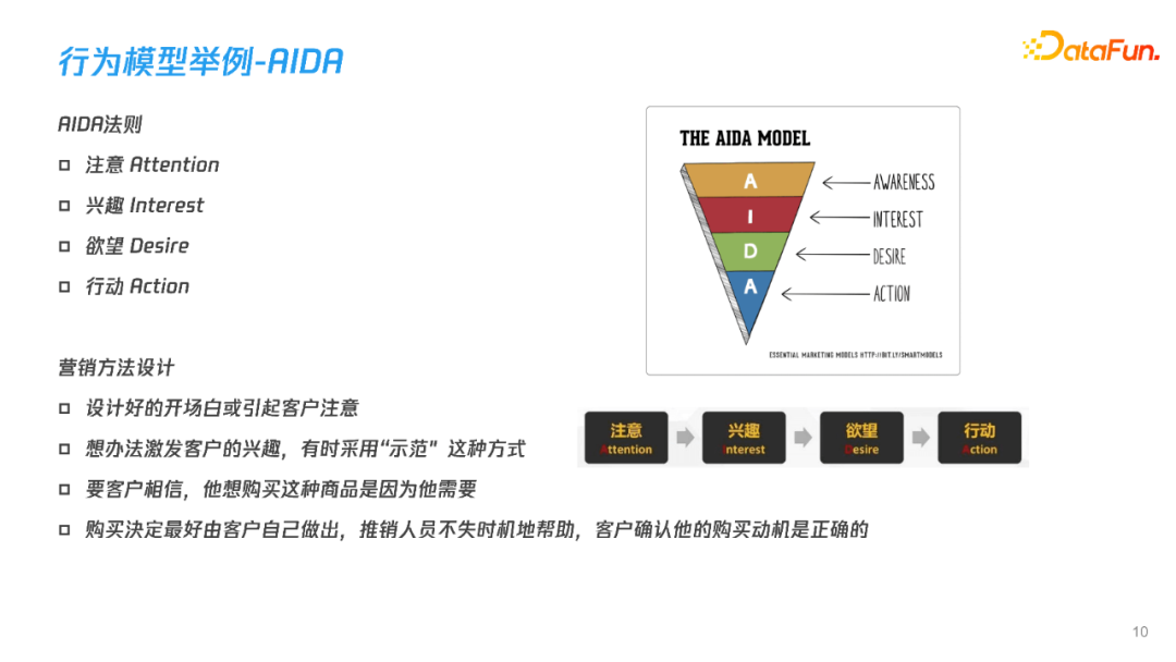 这个过程,涉及到各领域更深入的模型,举例而言,比如我们看这个行为模型,其实在传统营销方面,大家也提过很多行为模型,因为行为模型对应多个动作,最早的AIDA模型,用户从注意力,到产生兴趣,到最终有意愿行动,这种营销方法无论是传统营销里面卖车或卖大件物品,都会参照的方法,其实我们构建互联网场景下的营销活动也是类似的,互联网场景可以带来数据及时反馈,这些反馈及行为的指向性能够被捕获,变得更加精准和高效。