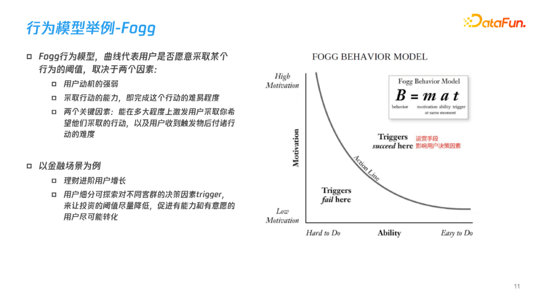 在金融营销场景下用户的行为模型更具有挑战性,金融决策背后通常有很长的链路,也有很高的成本,所以,如何让用户采取行动,需要考虑很多关键因素。