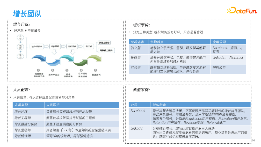 在支持业务增长的过程中,也相应地形成了增长团队的模式,业内各种架构分类,不存在孰优孰劣,只需判断在具体业务中对具体场景是否合适,无论哪种模式,都需要人员组合的应用,因为增长团队确实是一个综合能力的构建,这就包括增长经理、执行实验的增长工程师、增长数据分析师,以及增长营销师和增长设计师。在组织架构方面,也可分为独立型、矩阵型和混合型,没有好坏之分,只有是否合适。