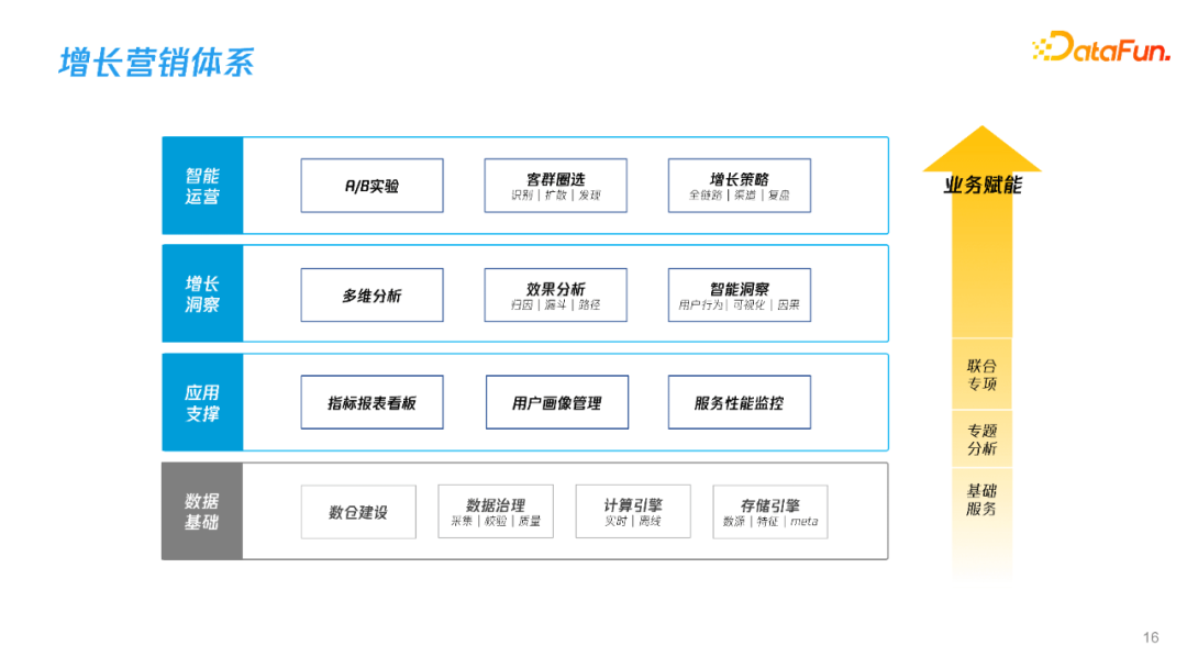 在达成业务增长的过程中,需要很多工具和方法,在实际工作中,增长营销体系的构建,包含多层,具体包含数据基础层面、应用支撑层面、增长洞察层面、智能运营层面。