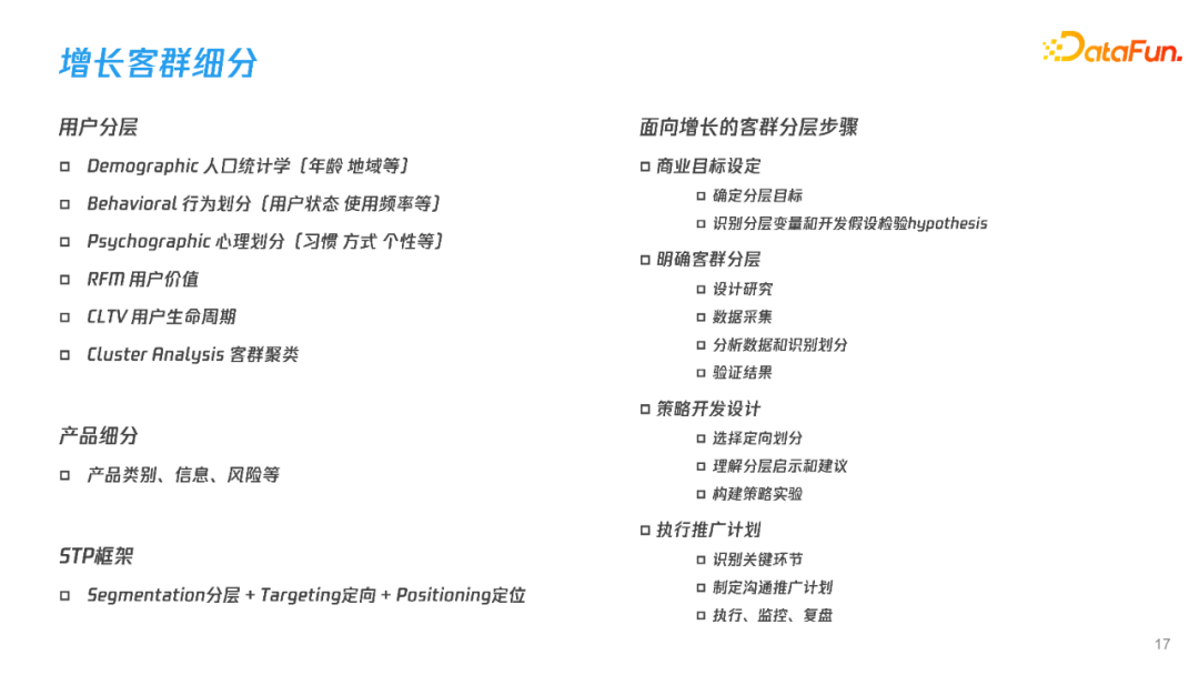围绕客群筛选,我们也做了一些工作,这里跟大家做个简单分享,围绕增长客群本身的一个细分,除了传统方法基于统计学、行为心理,或者客户周期、用户聚类之外,我们更多要思考用户增长的商业目标,如何能更有效地进行客群分层。