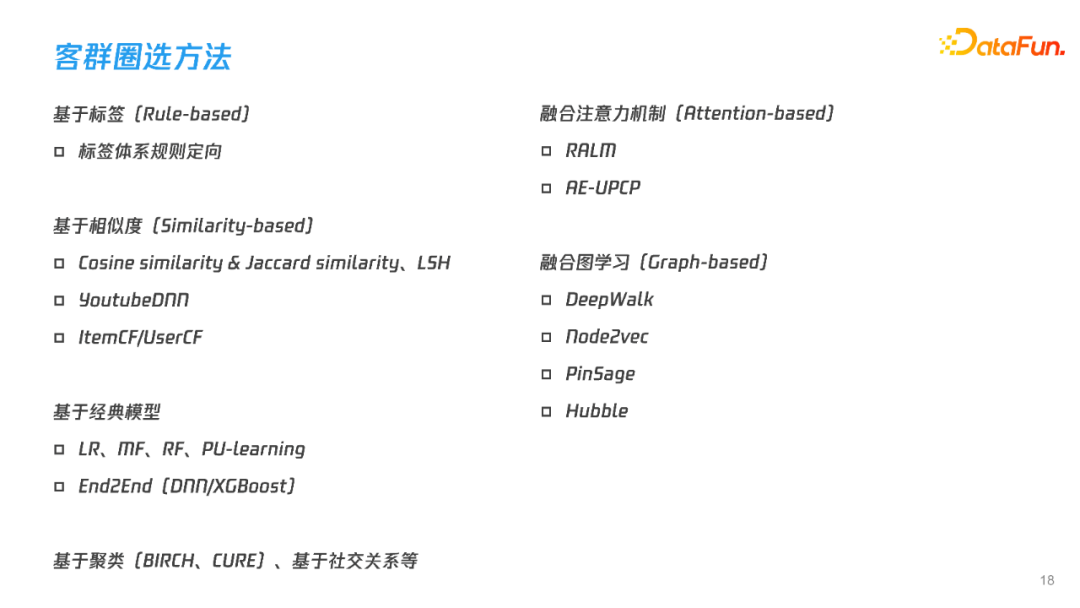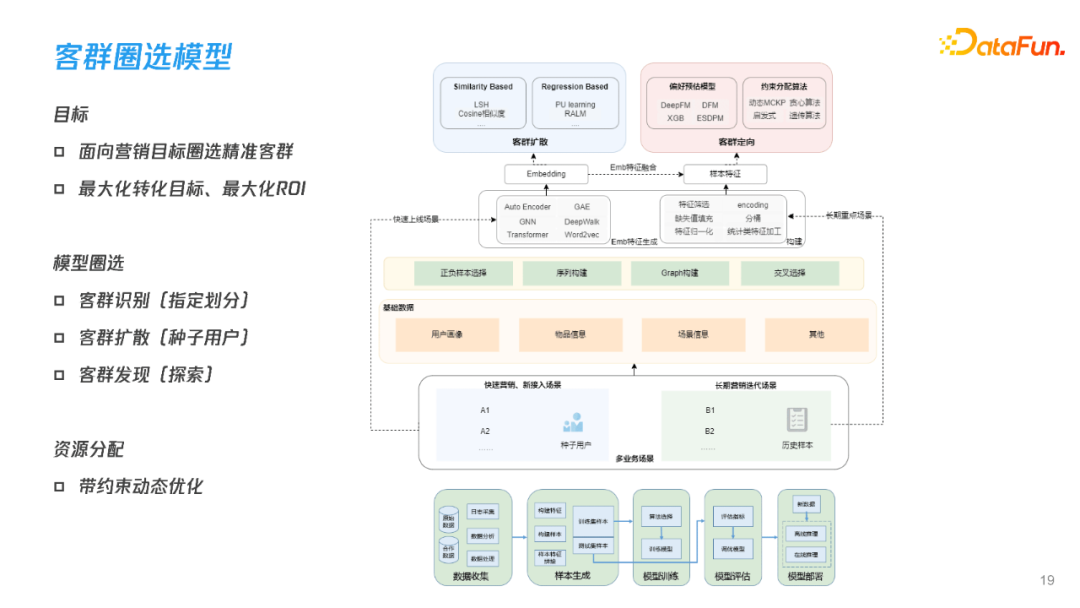 客群圈选模型,我们也采取了融合方案,包括对面向营销目标的客群圈选,一方面要支持业务客群的快速扩散,这里地业务本身已有高质量的用户群,除此之外,也会做更精准的客群定向,这就要融入前面所说的各种模型,包括基于相似度、基于深度的,结合注意力机制,结合图学习的方法,最终形成可互补式的客群圈选方案。