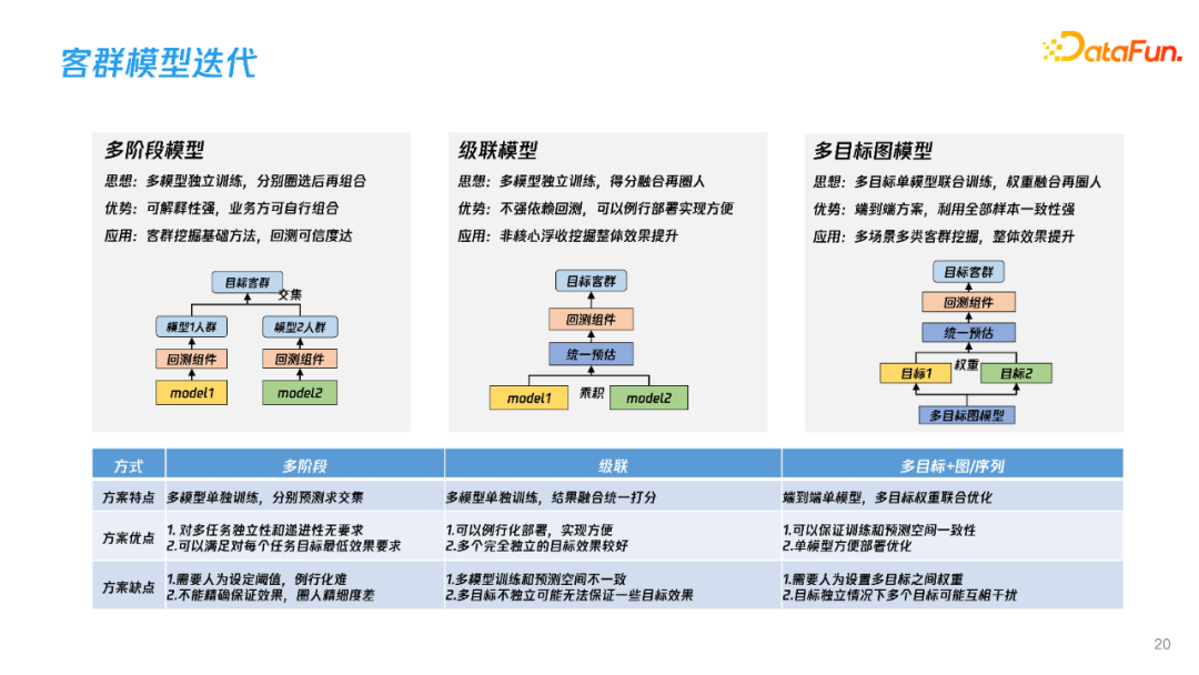 我们在方案探索过程中,其实有几个阶段,最早使用多个模型分阶段圈选,其实缺点很明显,就是效果不突出,圈选的量级达不到业务需要;后一个阶段,就使用集联的方式,两个模型的目标能够进行融合打分,但很多时候模型结果和预测的目标存在不一致的情况,两个模型目标不一定能达成共同协作;后来,我们也和业内一些先进方案做了交叉,一方面使用多任务学习进行多目标模型训练,同时加入图和序列的信息在模型当中,构建多目标的图模型。