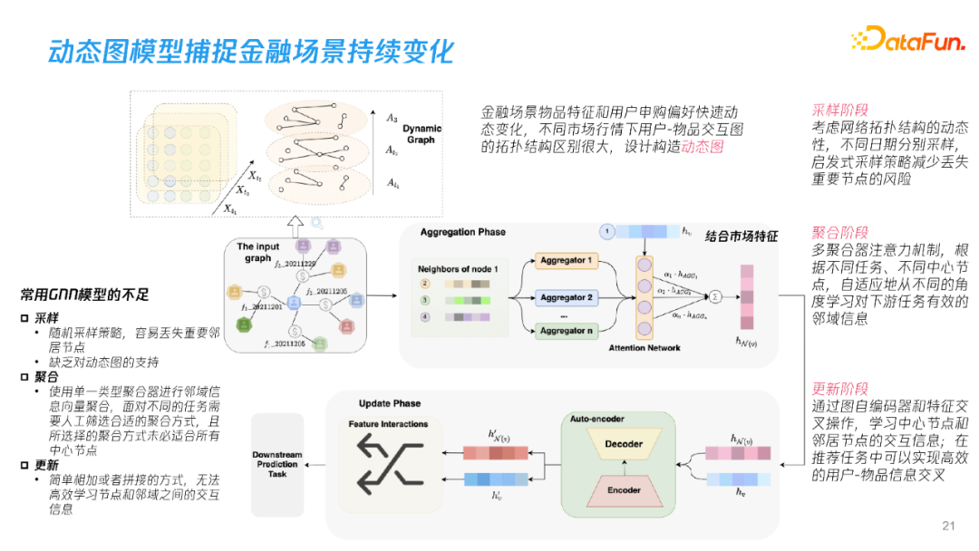 在金融场景下特别是金融领域,这种变化特别快速,只用传统模型或者多目标模型,还是存在不及时或不能有效挖掘相应信息的问题及种种bad case,所以,在市场行情变化很快的情况下,用户和物品的交互结构变化也很大的情况下,在图模型基础上改造了一个动态图模型,在原先这种图模型里采样环节、聚合环节和更新环节不适应的地方,进行相应的优化。这样做,金融场景动态变化的目标,在模型中得到很好的体现以及目标达成。