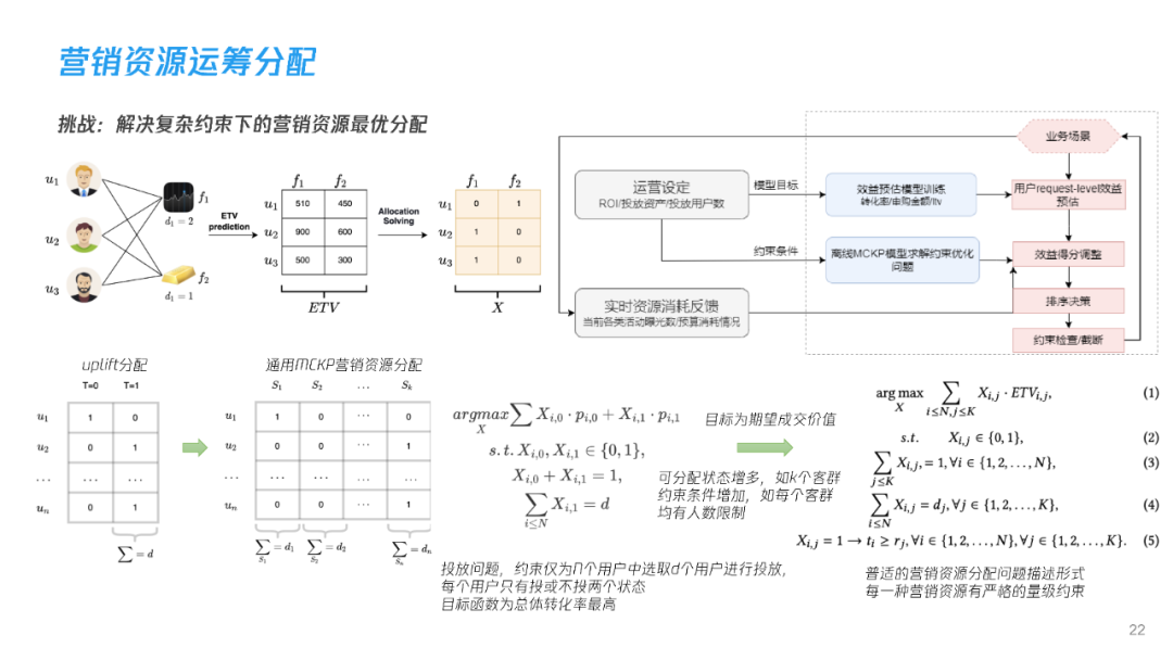除了把用户尽可能圈准之外,营销本身是一个供给侧因素更强的场景,怎样把营销资源有效分配下去,成为重点问题。举例而言,如果只有两类资产,怎样给到不同的用户或者用哪些营销资源给到不同用户,背后都有资产本身的约束,资产不是无限量供应,同时营销资源也不可能无限提供,这时,就是一个待约束的运筹分配问题。