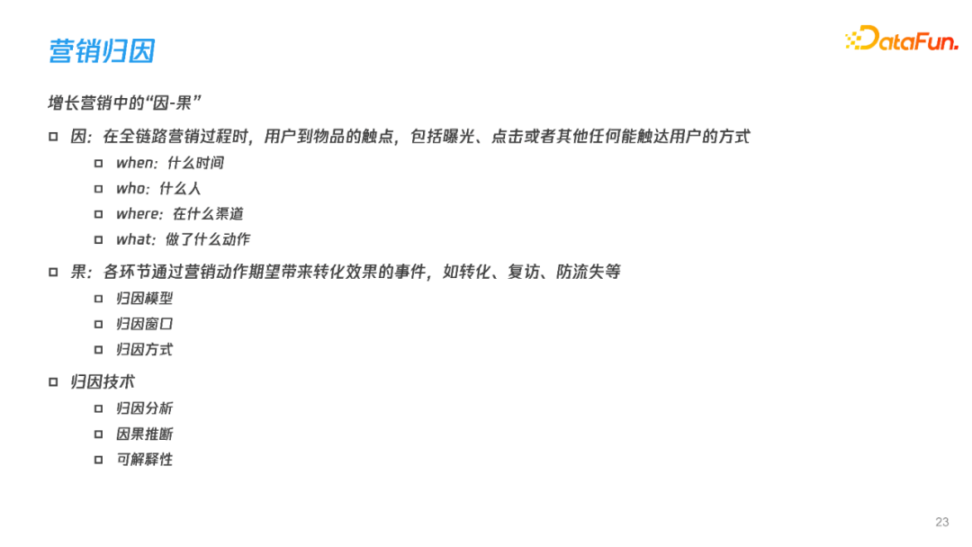 除了前面介绍的围绕客群、围绕全生命周期的持续化营销增长支持以外,营销增长另一大需求就是运营、产品、数据同学经常希望解答的因果问题,因果其实是有价值的,就是理解这些用户“如何被转化”“为什么被转化”“为什么没被转化”最后推导出下一次构建怎样的营销方法,让它转化得更好,服务得更好,体验更优。