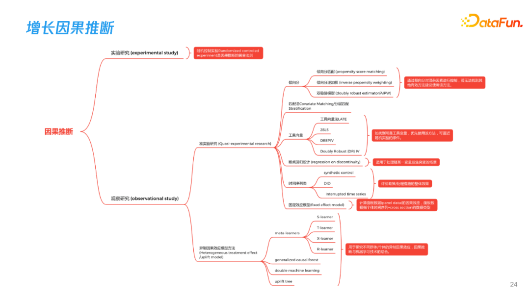 围绕营销策略以及增长路径,面对归因需求,我们也建立了一些可解释的方法,增长因果推断,在补充AB实验的基础上,通过观察的因果方法,比如倾向抑制因果效应模型等。这些因果推断模型的应用,可以帮助运营了解“为什么这些用户会转化、转化背后的因素是什么、下一次营销策略或增长路径如何调整会更优”。