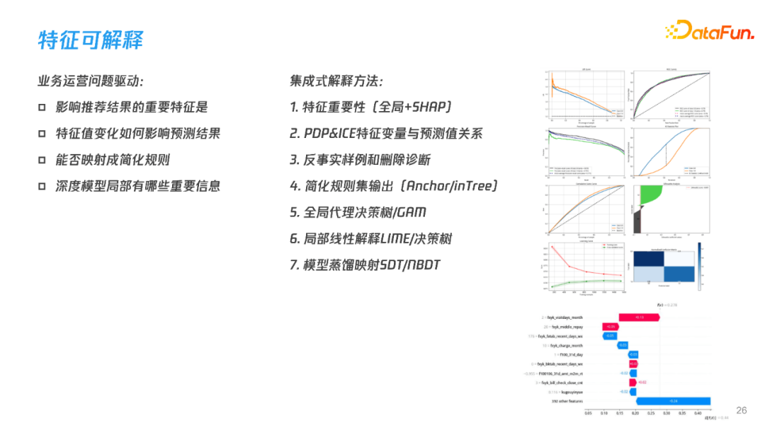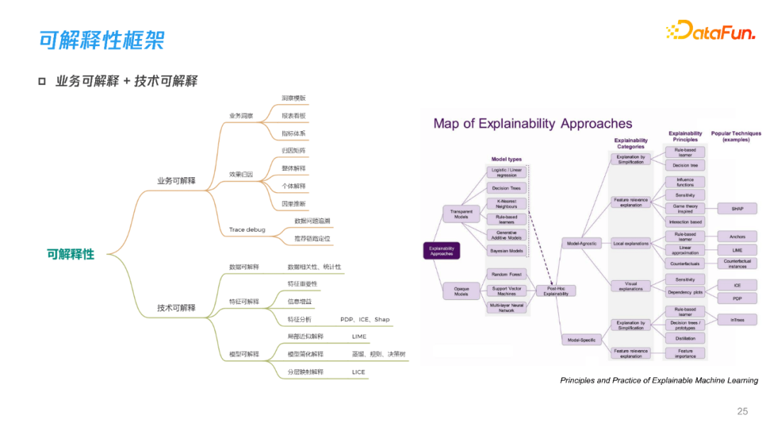 模型可解释已经在探索中,就像下方右图也有研究paper论文专门提出一系列的综合的可解释方法,但从业务需求来看,由于我们站在增长角度,贴近业务去思考,在业务本身的可解释方面,这种洞察需求会更高一些,我们也构建了相应的支持模板、支持方案(下方左图),对业务解释能快速见到效果。从技术上来讲,我们把它分成数据可解释、特征可解释和模型可解释三块。