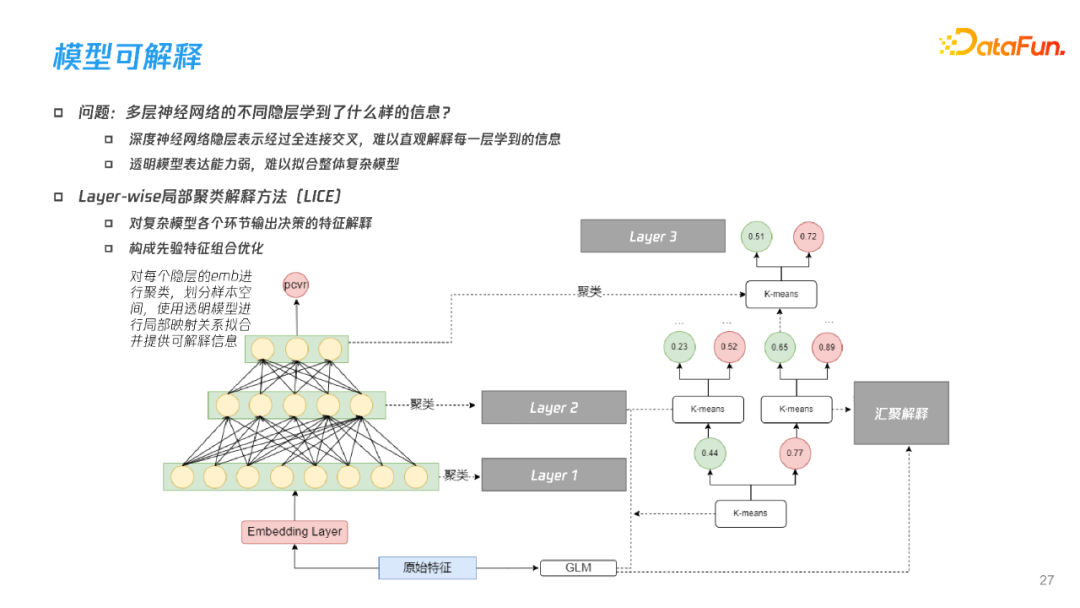 对于深度模型,可解释的难度较大,我们针对深度模型提了一个分层解释方案,我们自己称为“局部聚类的解释方法”,就是分层的对每一层的神经元,来看这一层的神经元做了怎样的决策,那其实这个方案的目的,就是来解释每一层的神经元到底在做怎样的决策信息。我们假设从原始的样本空间到每一层之后,都会进行样本空间的转换,那从先转换的一层的样本空间看,正样本和负样本各自的情况怎样,在正负样本之间,我们用透明化的、容易解释的模型进行一个区分,最后来看每一层的神经网络做了怎样的决策信息。这样更好地理解模型本身,怎么将特征和用户的结果进行了有效的匹配和输出,但图例是以简单的三层神经网络举例,事实上各种复杂的深度神经网络都可做类似工作,进行分层聚类的解释,这也是我们在深度模型可解释方面的一点经验。