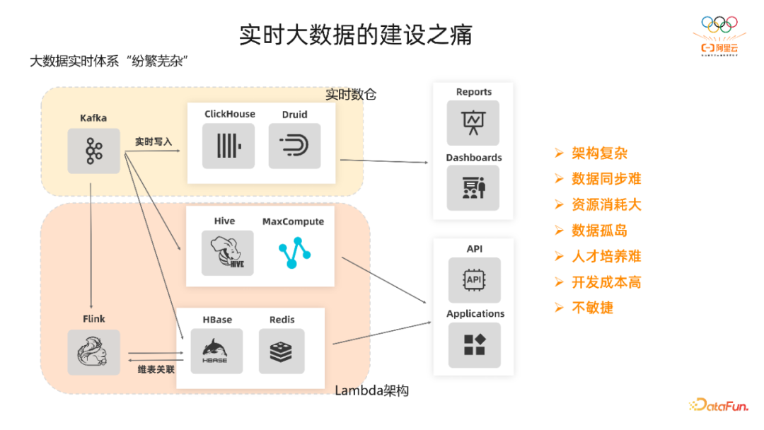 两个场景用了两套架构,导致实际使用时痛点也非常明显,包括:结构复杂维护难、同步数据困难、数据孤岛、开发成本高等,同时也需要维护很多套系统,无法快速响应业务敏捷需求。业务团队上手成本高,必须大数据团队支撑。