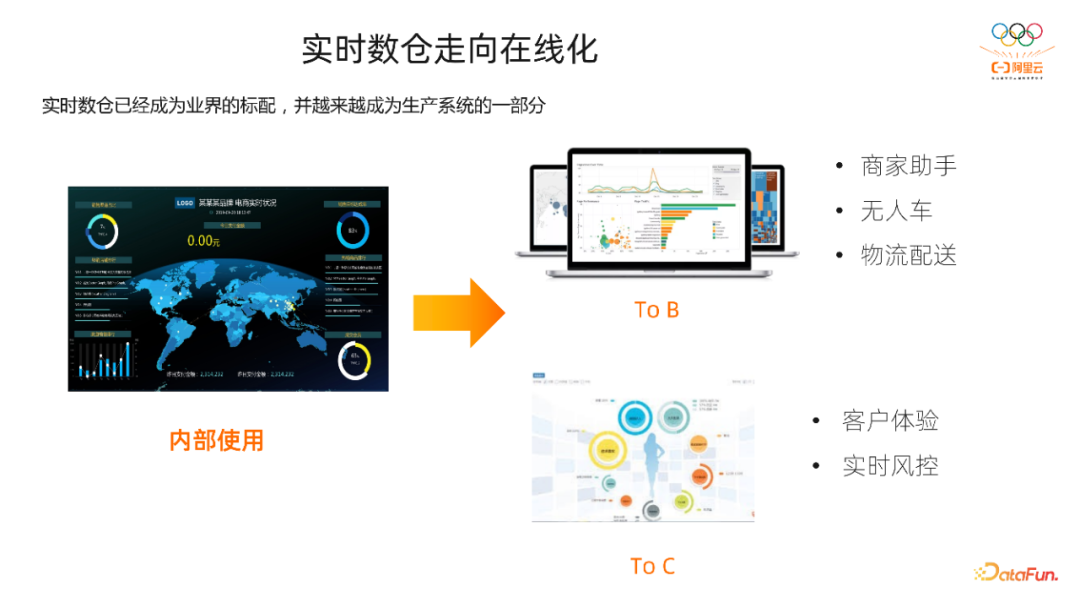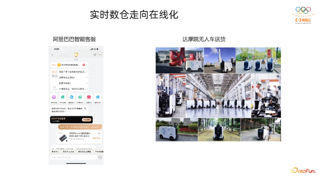 传统上,数仓是线下系统,并非用于生产系统。但随着业务的发展,线上数据也需要更加灵活,所以越来越多的业务把实时数仓作为在线系统来使用。所以我们可以看到,实时数仓开始从传统的内部使用,逐渐走到台前,被越来越多的ToB、ToC在线业务使用。如下图的阿里淘宝的智能客服和达摩院的小蛮驴无人配送服务,背后都依赖实时数仓技术。