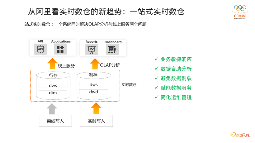 所以实时数仓的发展趋势,不再是把OLAP分析和线上服务两个场景完全割裂,而是希望通过一站式实时数仓去解决这个问题。业务方面更希望,无论是实时写入还是离线写入,都能统一写入至一个实时数仓,然后通过这个实时数仓来对外提供线上服务和OLAP分析两种能力。