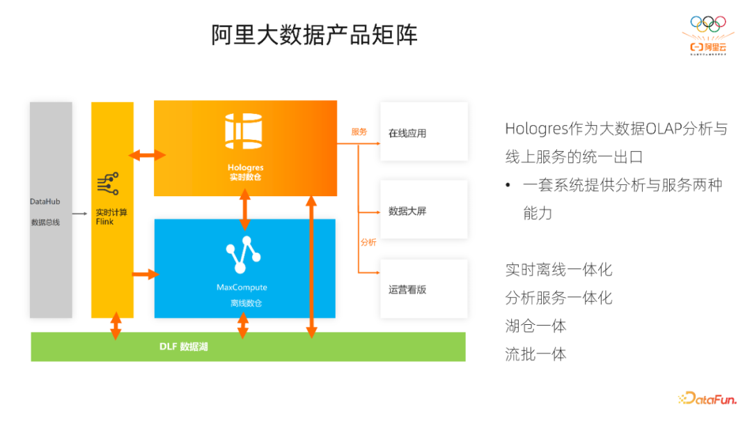 Hologres作为大数据OLAP分析与线上服务的统一出口,一套系统就能提供分析和服务2种能力。依托Hologres,再结合阿里大数据产品矩阵如DataWorks, MaxCompute, Flink, DLF等,能非常完美地支持实时离线一体、分析服务一体、湖仓一体、流批一体等场景。