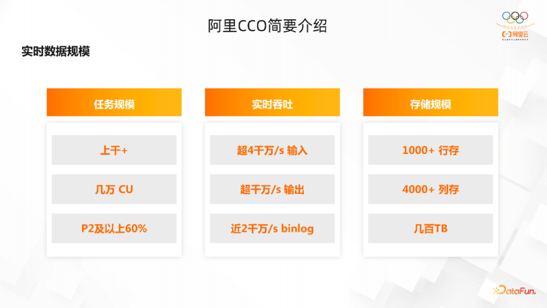 目前CCO业务背后的实时数仓,承载着上千个Flink实时任务,消耗几万CU,写入峰值4000万+条/秒,产生2000万+条/秒Binlog,有超过上千张的行存表和4000张+的列存表。虽然CCO的数据量在阿里不是最大的,但是业务链路却是最复杂之一。