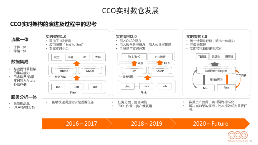 CCO的实时数仓建设也经历了传统数仓-流批一体数仓-新一代高可用数仓的三代发展过程,且目前第三代还在不断迭代中。