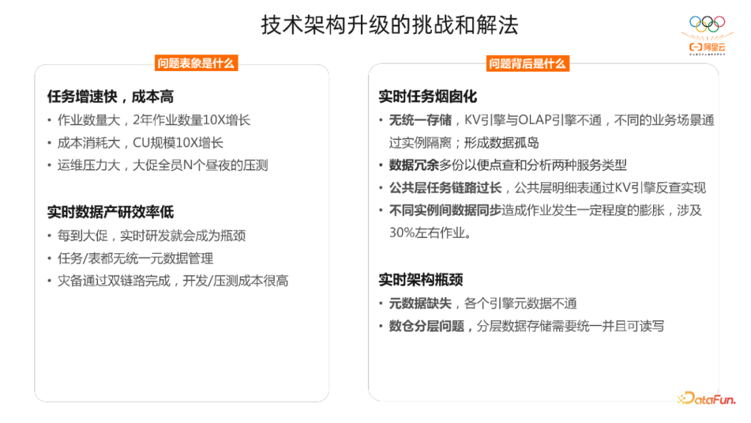 实时任务烟囱化。实时任务虽然做了很多中间层,但是整个烟囱化还是非常明显,KV引擎和OLAP引擎并不通,形成数据孤岛。数据需要多份冗余存储,形成很多数据同步任务,统计下来大概有30%的作业在做数据同步,浪费很多资源。
