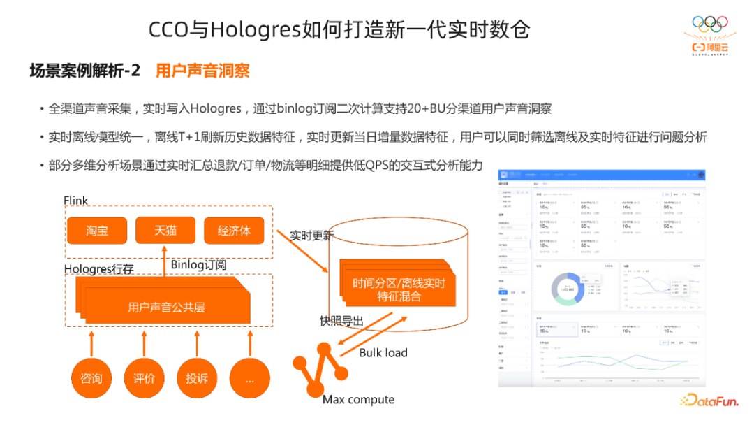 用户声音洞察场景主要是用于实时聆用户的诉求,并及时为用户解决问题。系统会实时采集用户在淘系购物体验的全链路数据,实时写入Hologres,并通过Binlog订阅二次计算,提供QPS实时分析的能力,支持超过20个BU的用户声音洞察。