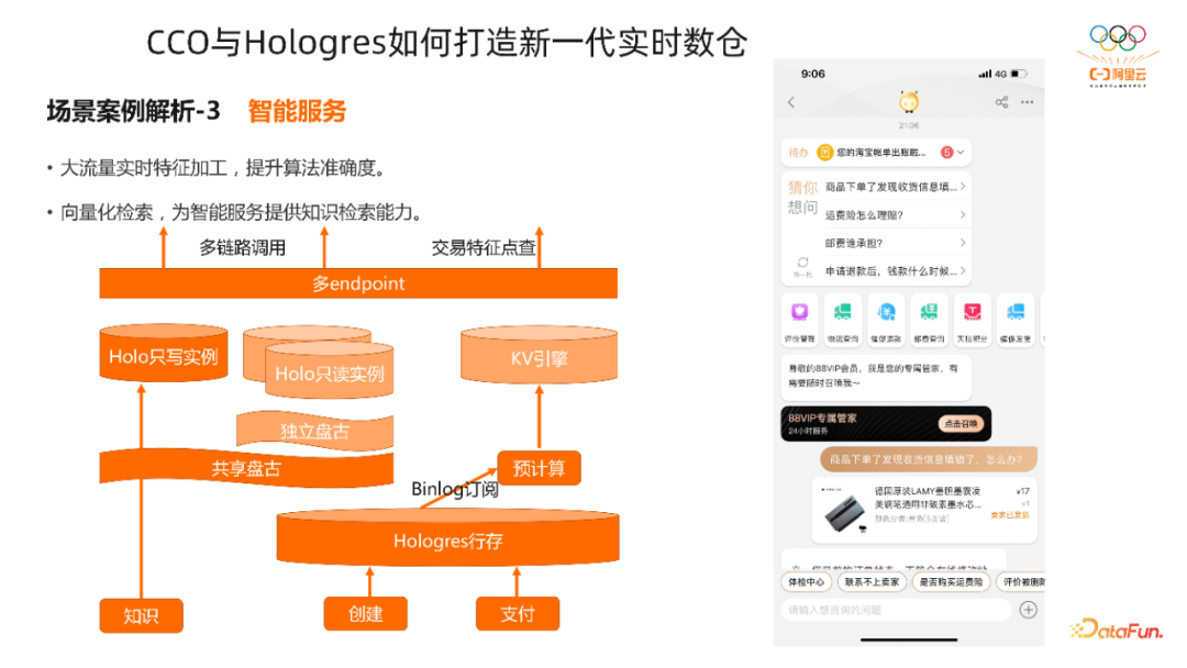 智能客服场景是是淘宝App上的一个to C能力,比如为88VIP的智能客服服务旨在通过智能化的服务降低人工服务成本。这个场景就是非常典型的在线服务场景,当用户发起服务请求时,智能服务需要快速响应并提供相应的帮助。在该场景中,充分利用了Hologres的在线服务能力,并使用了Hologres内置的达摩院向量检索Proxima能力,支持向量检索,通过对知识库的向量检索来极大提升了知识的检索准确度,减少了架构的复杂度。