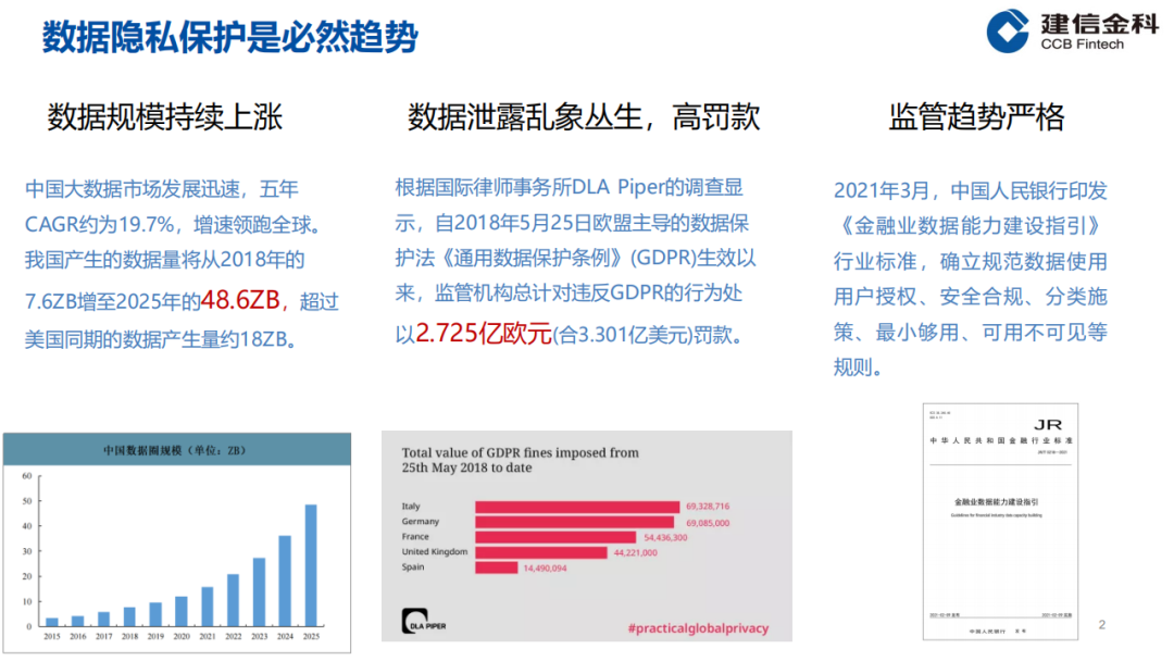 随着数据规模持续上涨,根据中国大数据市场的预测,预计2025年的数据量会将从2018年的7.6ZB增至2025年的48.6ZB,超过美国同期的数据产生量约18ZB。同时带来的是数据泄露隐患逐渐提升,自2018年5月25日欧盟主导的数据保护法《通用数据保护条例》(GDPR)生效以来,监管机构总计对违反GDPR的行为处以2.725亿欧元罚款。中国人民银行也在2021年3月印发《金融业数据能力建设指引》行业标准。同时,对于数据的隐私保护已经得到国家的高度重视,发布了《个人信息保护法》和《数据安全保护法》等法律法规。