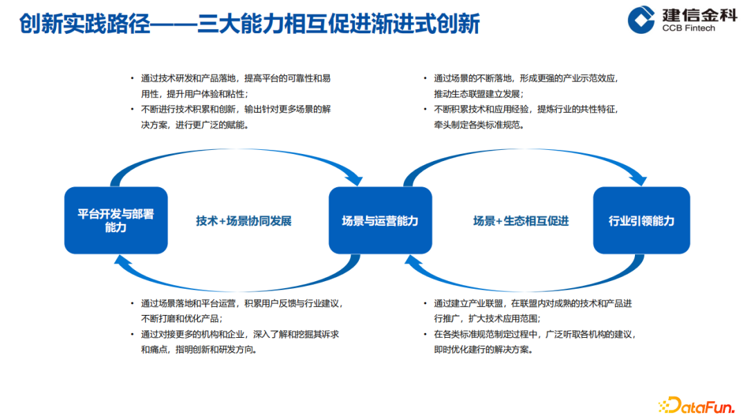 银行是信息化程度非常高的行业,随着数字化进程的发展,银行每天也会产生大量的数据,也存在融合外部数据价值来提升业务性能的诉求。建信金科从2019年初开始涉足隐私计算领域,在创新实践过程中,我们一方面进行平台的研发,一方面通过应用场景和试点验证我们探索的方向。此外,我们也在同步参与行业标准以及一些规范的制定,并且向同行及科技公司学习,最终形成了平台+应用+标准的循环创新实践。