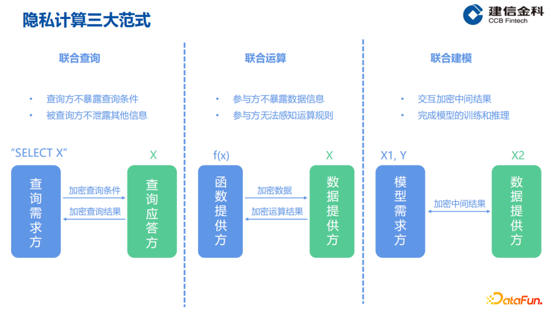 从上层应用来讲,我们主要把隐私计算分为三大范式:联合查询、联合运算、联合建模。