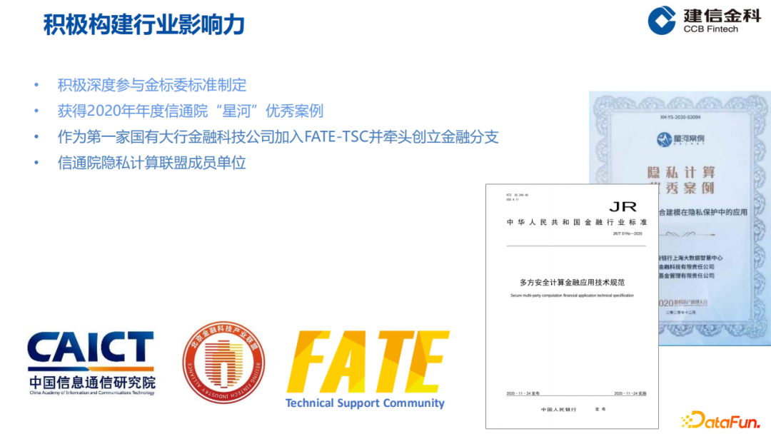 在行业影响力构建方面我们也在积极布局。首先,建信金科积极深度参与了金标委等行业标准的制定,以及其它一些规范的编写工作。并且建信金科是第一家作为国有大行金融科技公司加入FATE-TSC,在其中参与技术发展决策及版本更新维护,提出金融领域的实际诉求,并不断优化迭代完善。基于此,建信金科在联合中国银联、微众银行、光大科技,牵头创建FATE金融行业分支,打造满足金融行业监管规范的联邦学习系统。同时建信金科已成为信通院隐私计算联盟成员单位。同时,积极参与北京市金融科技产业联盟研究专委会的课题研究,由建信金科牵头、光大科技公司参与的“基于隐私保护计算技术的金融领域数据融合应用研究”成为四项一类重点课题之一,由专委会进行专项跟踪管理,促进隐私保护计算技术研究成果的落地转化,最终评选为联盟良好课题。