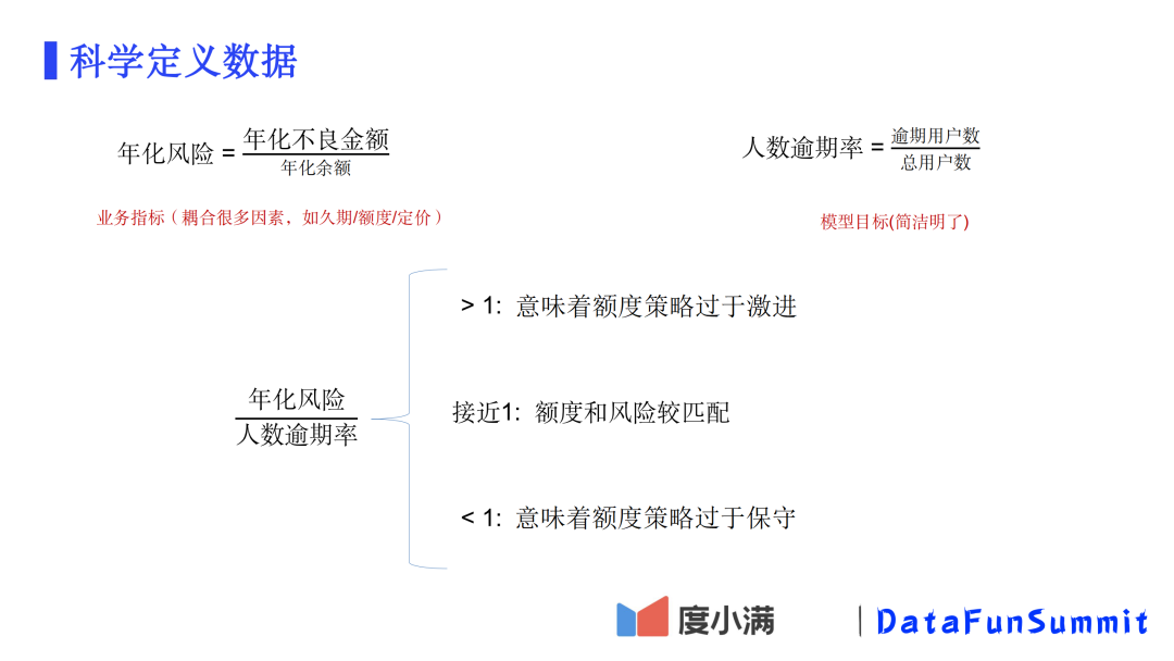 假设有一个模型可以较好地预测人数逾期率,那么我们怎么与年化风险目标挂钩呢?即模型的目标如何与业务的目标对应。在真实的业务场景中,我们很容易发现,资产的年化风险与人数逾期率(MOB12)的比值是一个在1附近的数值。对于这个数值的解读,即当年化风险除以人数逾期率显著大于1时,意味着整体额度过高,尤其是风险相对低的客户的风险敞口没有控制好;当年化风险与人数逾期率接近时,意味着额度和风险匹配得比较好;而当年化风险除以人数逾期率显著小于1时,意味着整体的额度策略过于保守,虽然从风险角度讲是好事,但从业务视角看其实是制约了整体的余额规模。经过一定量的迭代以后,往往都会使得年化风险和人数逾期率之间的关系趋近于1。这时候如果人数逾期率预测得足够准确,那么意味着年化风险预测就会很容易。
