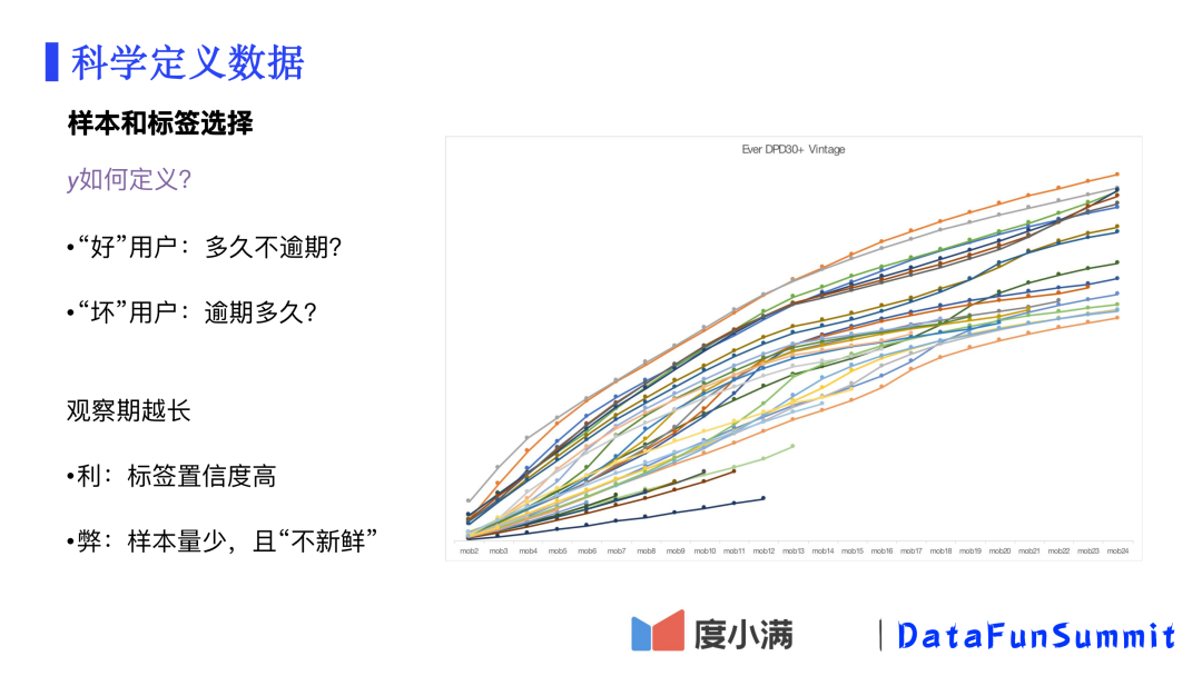 同样的,对于“好”的定义,一样有一个时间问题。显然,观察越长时间没有逾期发生,用户“好”的概率越高。然而对于用户的观察时间越长,会导致可用于学习的样本量越少(尤其是新发展的业务本身数据就很少),并且样本都是过去很久以前的数据(这在内外环境快速变化的情况下影响更大)。