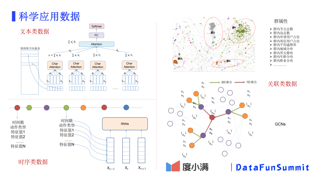 关联类数据:1)分群算法:群属性作为特征;2)基于深度图卷积网络,充分利用相邻节点的信息。