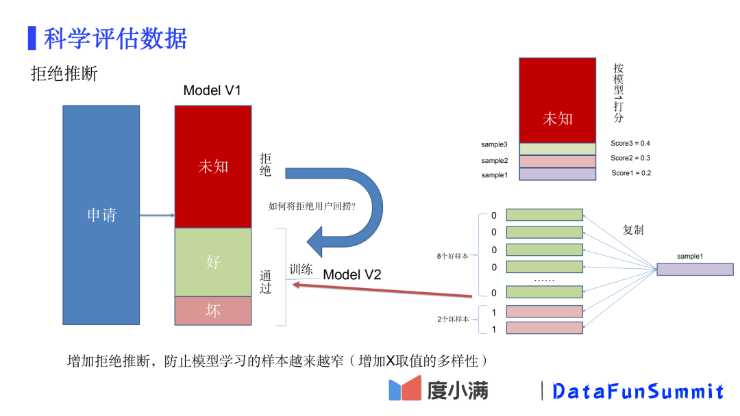 那些被拒绝掉的用户,是没有风险表现的,只有那些最终通过且发生信贷行为的用户才有风险表现。试想,用于学习的样本都是历代模型认为较好的客户,随着模型不断迭代,模型学习的样本向好用户收敛,样本的特征空间就越来越窄了。常见的一种方式是引入拒绝推断,给拒绝的用户赋予label,让其参与到模型训练里。上图介绍了一种做拒绝推断的方法。