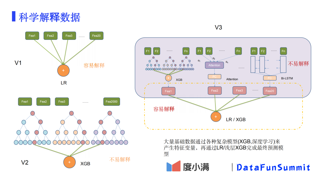 V3: 两层模型:把成千上万的变量基于数据源,通过各种机器学习、深度学习的算法构建子模型,然后把这些子分作为上层LR或浅层XGB模型的输入,完成最终的模型。优点是在顶层模型上解释性很好,子分与结果具有一定线性关系,可以快速定位子分的问题,非常便于排查问题。