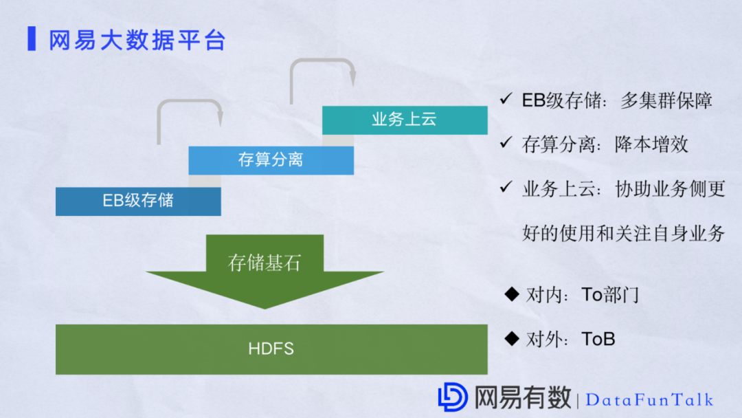 当前网易大数平台已经实现亿级存储,拥有多个机房和多个集群保证务数据不会丢失。同时为了帮助业务以较小的资源实现较好的利益,网易实行存算分离,不再让业务受限数据和计算绑定。存储仍然是以HDFS为主。另外对业务比较关心的成本问题,网易大数据平台提到的业务上云方案使业务可以更加专注的发展。