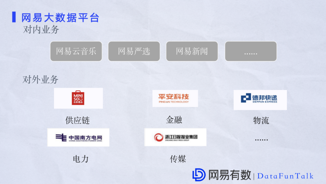 目前网易大数据担任了集团内,如网易云音乐、网易严选、网易新闻,和集团ToB业务,如供应链、金融、电力传媒等等。上面列举的只是一部分,多个场景已经在使用我们的服务并且已经成功落地。