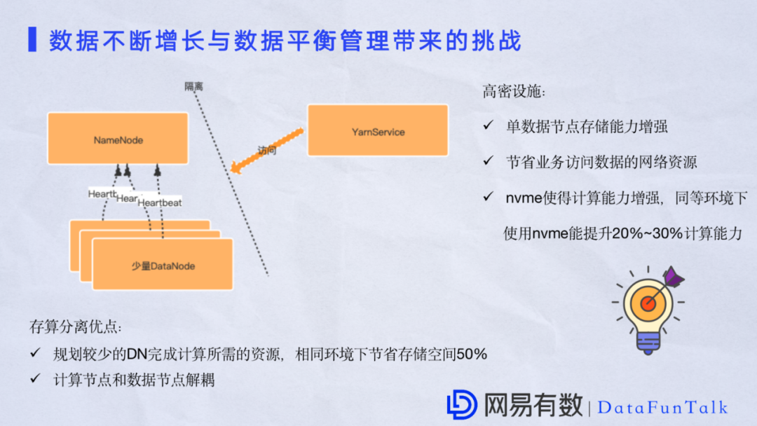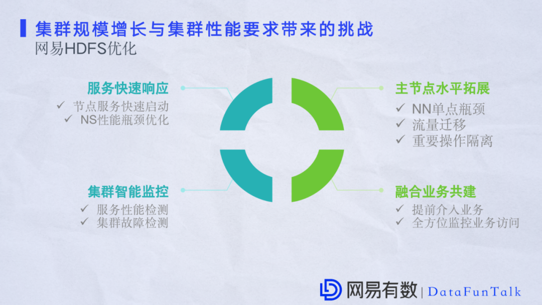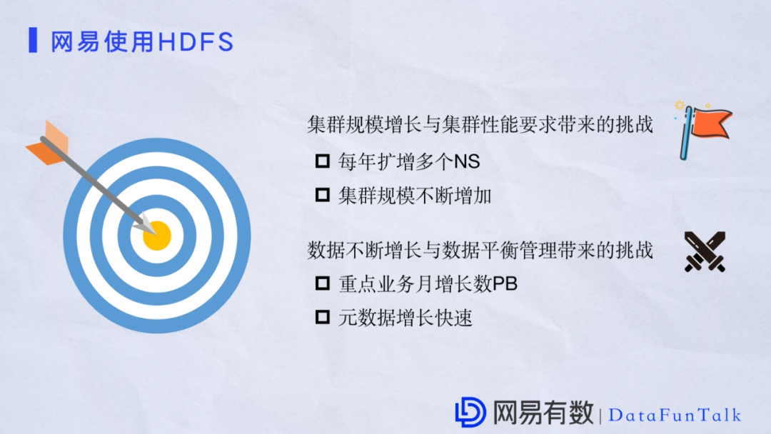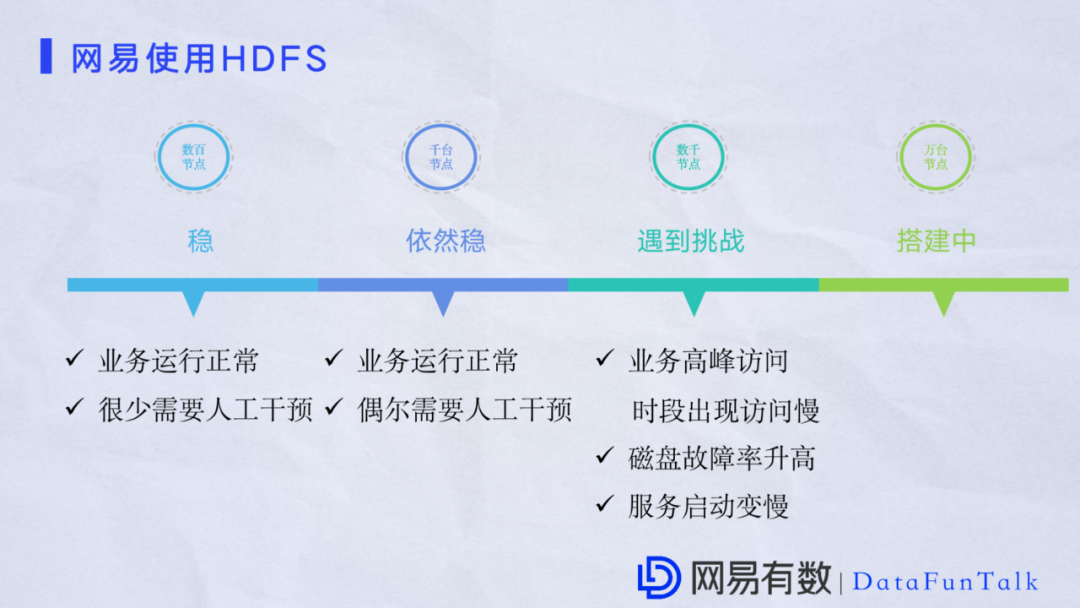 对于HDFS的挑战来说,有一些厂商专注于集群,还有一些厂商专注于硬件。我们根据自己的发展规划以及实际场景总结了网易遇到的两大挑战: