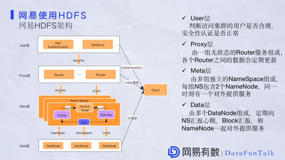 这是当前网易的HDFS架构图,主要是分为四层,自上而下分别是: