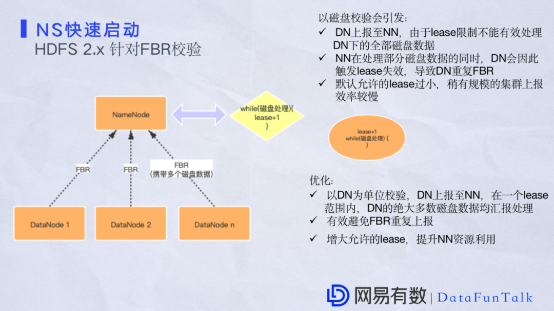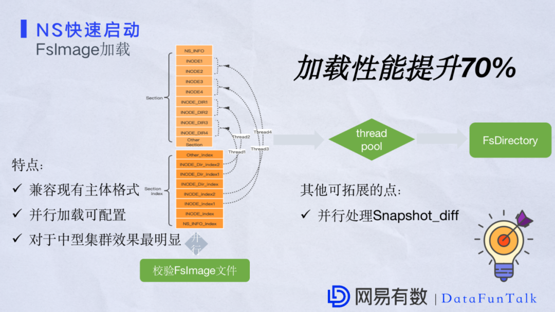 这里补充两点,在NameNode真正加载FSImage之前,对于一个比较大的文件,校验是比较耗时的。同时在NameNode解析完之后对于串行处理元数据是非常低效的,我们也做了并行加载。