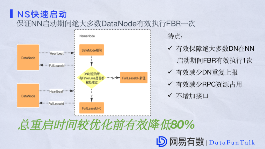 这里要着重说明一点的是整个过程不需要增加任何接口,原因是DataNode在是否被允许全量上报期间NameNode有一个Lease认证,社区版也是这么做的。然后NameNode端如果发现有空闲的情况下就会向DataNode发送一个Lease,DataNode拿到这个Lease就进行一次全量上报,整个过程是通过心跳触发的。对于在启动优化这一块除了上面这几个部分之外,我们还做了其他的工作。比如NameNode端关于全量和增量队列的优化,这一点在社区版里是没有的。还有是对修复的有效控制,因为checkpoint原生版本会比较快,尤其是业务量比较大的情况下重启时checkpoint会快速触发。再就是在editLog滚动和拉取的时候,我们也做了一些有效的控制,并且对于DataNode端增量上报也需要做一些延迟处理。在整个NameNode重启时间相较于优化能提升80%的性能。