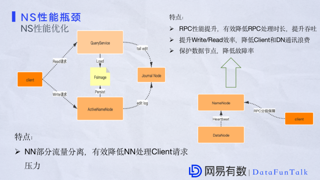 第一是关于在客户端读写请求时,业务端通常是从NameNode开始,这里有时候NameNode会出现响应变慢的情况,通常在业务量比较大的情况下,还有NS管理数据比较多的时候。优化做法是将部分流量分离出去形成一个单独的服务,定期加载FSImage,更新EditLog。这里把一些查询功能从原生的NameNode分解出去,这样可以有效缓解NameNode压力。目前已经在多个集群上得到充分的验证。