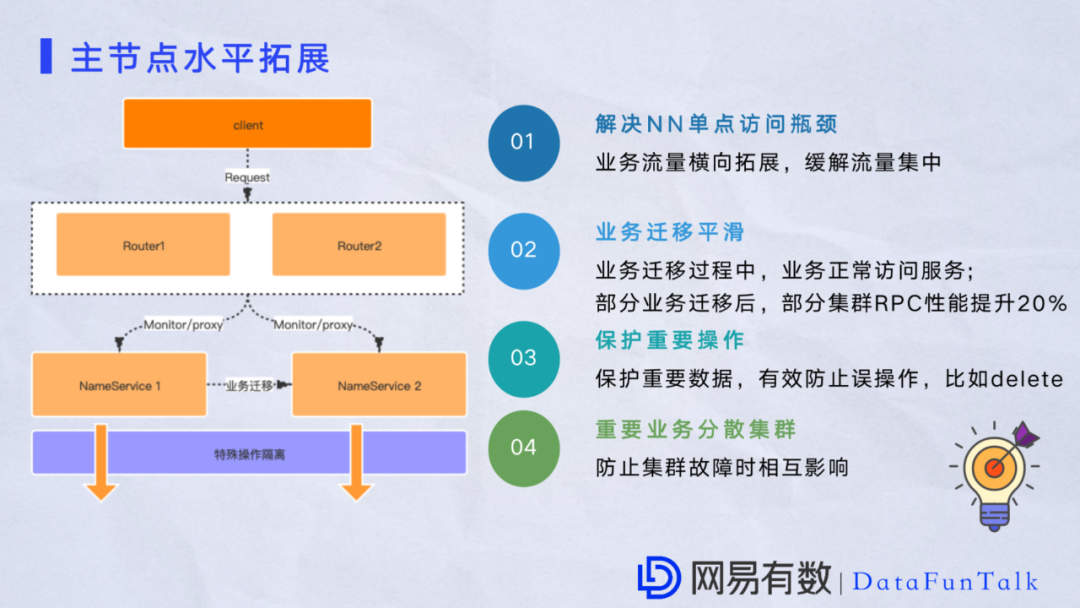 NameNode性能拓展问题:当NameSpace管理的数据越来越多时NameNode存在性能瓶颈,所以要从NameNode性能瓶颈出发。集群管理也非常重要,有一些重要的业务不应该和其他重要业务放在一起,因为有时两个同等重要的业务放在一起可能会有相互干扰问题,这个时候需要做一些评估,把他们放在不同的NameSpace上,均衡提升NameSpace的性能。
