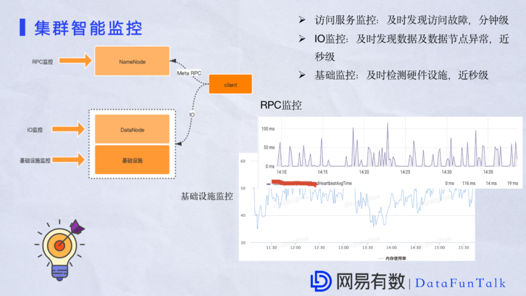 在集群的优化方面,除了软件性能以外监控也是非常重要的一点。我们通过Matrix指标和自研脚本对当前正在运行的服务做全方位监控,包括对各个服务,RPC的监控。一旦RPC出现异常,比如队列延迟高,Handler延迟高,均能快速发现问题。还有就是对IO的监控,比如某一个DataNode的IO非常高,也能快速发现。另外对于一些基础设施,例如cpu高还有内存高都可以做到秒级发现。如图中对NameNode端的DataNode心跳处理耗时,平均是十几毫秒。