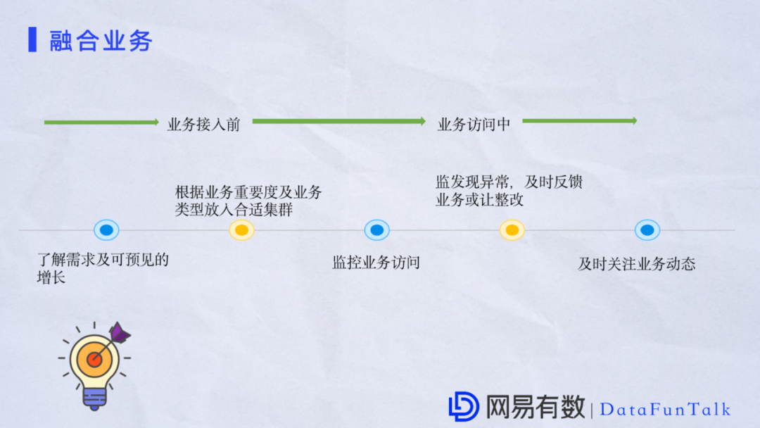 在关注集群和系统本身的同时业务也是很重要的一部分。因为管理的业务量比较多,节点数也比较多,业务的融入本质上跟我们是相辅相成的。举个例子,某天我们接受了一个业务需求,一开始我们对业务需求没有充分了解,可能会将这个业务存于某一个重要的集群中,之后可能在某一时刻这个业务会产生比较大的流量影响其他业务。这种情况应该避免,所以在接纳业务时需要做好的一点是及时了解业务需求以及可预见的增长,根据业务的重要性以及业务类型放入一个合适的集群中。平时在搭建集群的时候也要区分专有集群和公有集群,在接纳业务之后也做好对整个业务的监控。如果发现异常行为,要及时进行反馈。在业务进来之后要关注业务动态,尽可能了解业务走向。