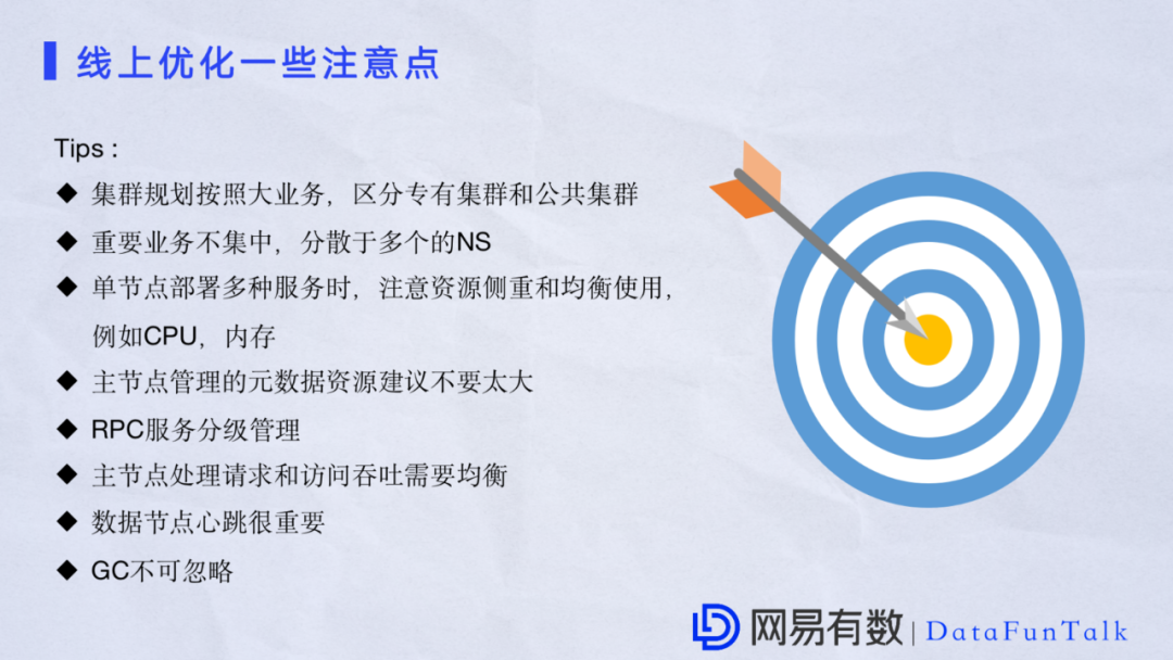 目前网易在集群上有多个机房做保障,有多个自有集群和多个ToB集群业务,并且单个NameSpace也超过数千个节点,业务吞吐量每天达到了数十PB。在访问上单个NameSpace和单个NameNode客户端接受访问已经达到了亿级别,同时在冷热技术上也有建树。比如现在完全可以提供数百PB规模的冷备集群同时保证所有线上服务正常可用。这里还有一个挑战是保证服务24小时可用。我们对服务通常是做全实时监控,对硬件做全实时监控,对一些重要的业务做隔离。